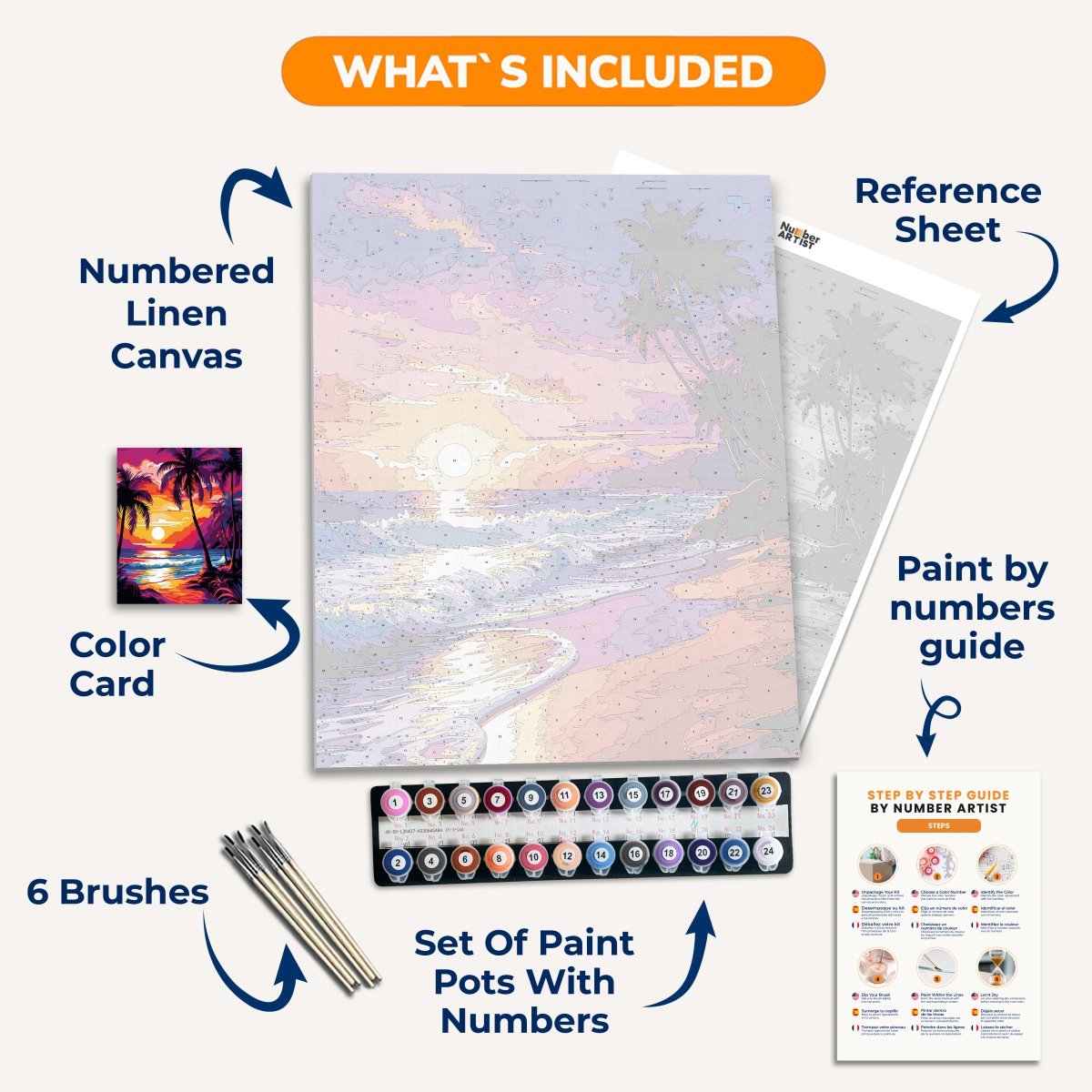 Premium paints, six brushes, linen canvas, paint by numbers guide, color card, and reference sheet.